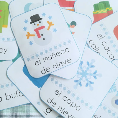 ¡Hola a todos! Ya se siente el frío, por eso aquí os dejo algo para introducir el vocabulario de invierno. Esta vez las tarjetas (flashcards) son un poco diferentes. Me he dado cuenta de que en mi Instagram me siguen muchos profes de educación especial. Por eso he decidido hacer el material más grande para los alumnos con algunas deficiencias (dibujos más grandes, la letra más grande y más clara y el tamaño de la tarjeta también más grande).